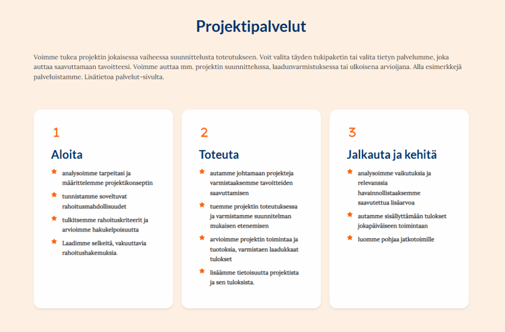 Sivustomme palvelee asiakkaitamme ja kumppaneitamme esittelemällä palveluitamme sekä viimeisimmät tiedot meneillään olevista projekteista ja muista toiminnoista. Verkkosivuston luomisprosessi osarahoitettiin yritystoiminnan käynnistystuella.